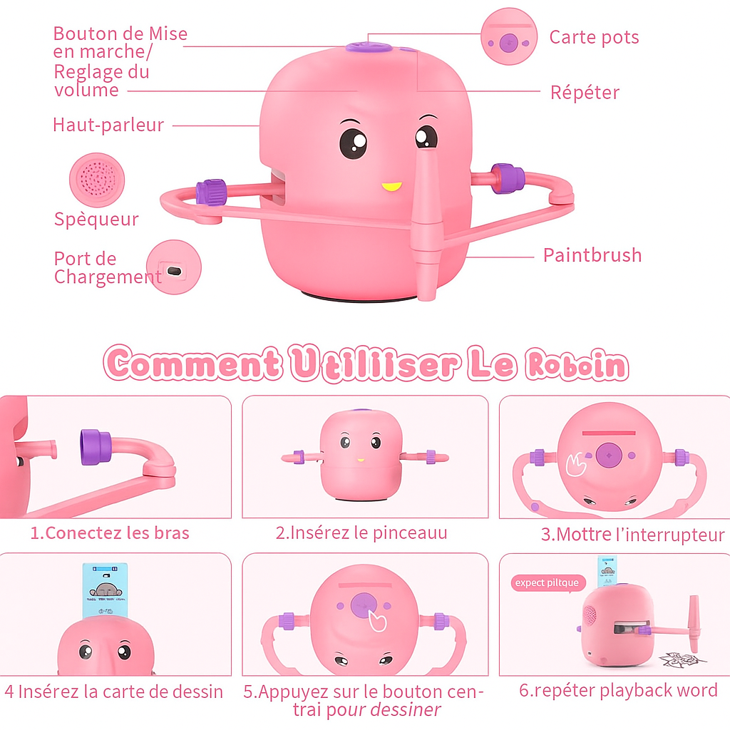 Le robot fonctionne environ 4 heures après une charge complète, offrant beaucoup de temps pour laisser libre cours à la créativité !